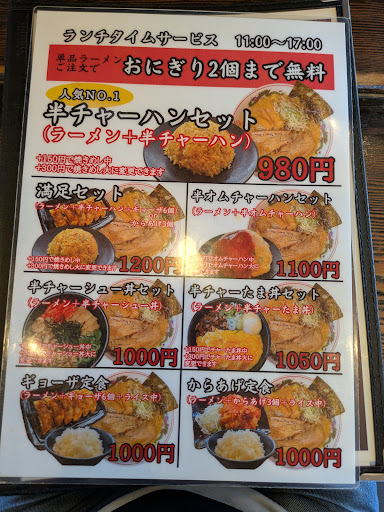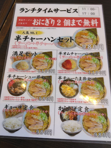 Read more平日の12時すぎに訪問、店内はほぼ満席で10分ほど待ち、テーブル席へ。 ランチは最安で中華そば830円(税込み)を注文すると、おにぎり2個無料、麺大盛無料、キムチ、ネギ等セルフトッピング無料と、最近のラーメンにしては、非常に安いです。