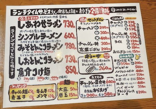 しあわせラーメン(豚骨醤油)と!焼き飯(少)を頼みましたが… う~~~ん…可でもなく不可でもなく…普通ですかね~…焼き飯は少し味が濃いかったですが…まぁまぁ美味しかったです👍 ただ!!米が少しベチョっとしてたのが残念ですね~~~