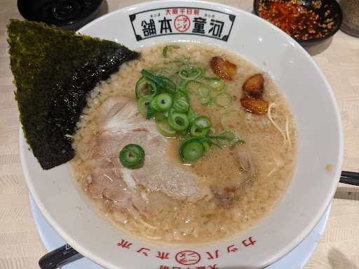 オススメは河童ラーメン味濃いめ、ハリガネです。 ラーメンが来るまでキムチを食べましょう、酸っぱさと辛さが控えめです。胡麻をかけると美味しい。 まずは調味料を追加せずにそのまま。口がしょっぱさに慣れてきたら、味変はニンニクを絞りましょう。ニンニクは入れすぎると辛味がでてしまいますので、二片までで。 替玉を注文したら、卓上の焼塩を入れて塩とんこつにしましょう。 ここまでするとスープは飲みきれませんが、満足。
