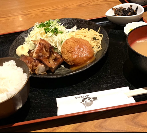まず白ごはんとお味噌汁、たっぷりのサラダが美味しい。 メインもボリューミィ。「鶏の味噌焼き」は初めていただきましたが、焼き目が香ばしくついた皮目、お味噌がめちゃくちゃ美味しかった!それに「クリーミーコロッケ」。 付け合わせのパスタも毎回、味が変わってるみたいで飽きない。 50円値上げされたのですが、それでもコスパいいですよ!「ちゃんとした昼食」がいただけます。