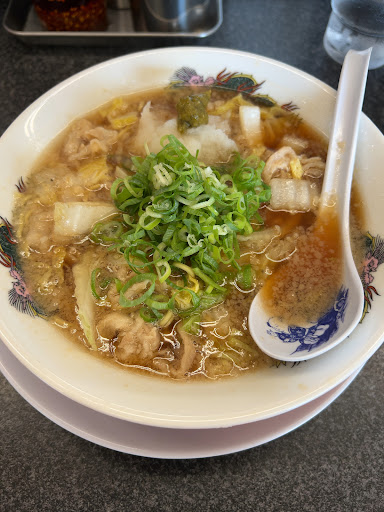 豚骨ラーメン🍜いつも食べてます。主人はキムチが大のお気に入りでいつも沢山皿に盛ってます。もう少し大きな皿があればなと思います。それからポットに入ったほうじ茶!とても暖かくて美味しいので何回もおかわりしています。そういった小さなサ−ビスがとても気にいってます。餃子も薄皮でしっかり焼かれていてカリッと香ばしい味がして年配者でもしっかり噛めて美味しく頂いてます。ラーメンも本当の豚骨味を堪能しています。ただ、支払い方法にクレジットカードが使えないのが残念です。それと手−ブルにティッシュペーパーを設置して欲しいです確か前には...