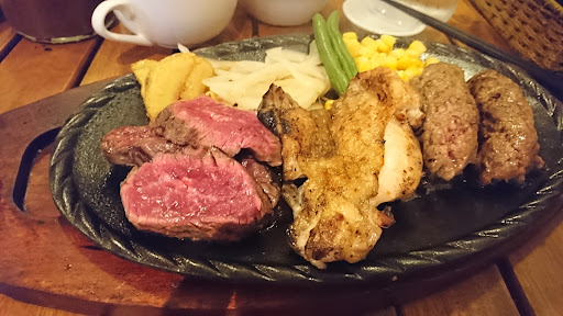 ハンバーグ120g、カットステーキ70g、 チキンハーフ110gの お肉3種類全部盛りの 炭焼ミックスグリル 1,598円 ステーキも旨いし チキンも旨いし このメニューはお薦めです!