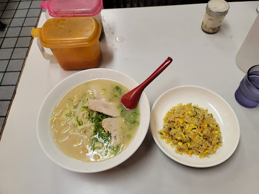 Read more▪️R5.11.18(土)13:20訪問。 約35年ぶりの訪問です。 学生時代、彼女(現在の妻)と布施に遊びに行っては、ここのラーメンを食べていました。 それが、息子と来ることになろうとは。 親子ニ代で来店とは、感慨深いものがあります。 ほぼ記憶もなく店に入って、こんな感じだったのかなぁーって思いました。 お世辞にもキレイとは言えない店内。 昭和感が漂っており、私にとっては、とても良い雰囲気。 ラーメン(並)、焼飯(小)、ギョーザ(6ケ)のBセットを注文。 ラーメンが大盛にできるとのことで、大盛にしました。 待つこと8分、ラーメンが到着。 デカイ・・・洗面器級の器でやってきました(笑) 続いて、焼飯、ギョーザが到着。 狭いカウンターがいっぱいになりました。 ラーメンは、少々粘度のあるスープですが、とてもあっさりしており、ライト豚骨で美味い。 焼豚は、パサパサ系で、味がしっかり付いていて美味い。 おろしニンニクと、オリジナルの薬味「ニラ辛子」で味変。 まずはニンニクを投入。 スープの旨さが倍増。 このラーメンには、ニンニクを入れるべきです。 そして「ニラ辛子」。 ピリ辛の、全く違うラーメンになりました。 これはこれで美味しいが、ここの店のスープの良さが分からなくなるので、ニンニクでやめとくべきだと思いました。 焼飯は、ややしっとり系の焼飯で、塩メインの味付けかなー とても美味い。 ギョーザも具沢山で、ニラがきていて美味い。 ラーメン大盛のBセットで1100円。 この味、この量、この価格ならコスパ良すぎでしょう。 流行りのラーメン屋のような、こったラーメンではありませんが、ふと思い出したら食べたくなるようなラーメンでした。 ...
