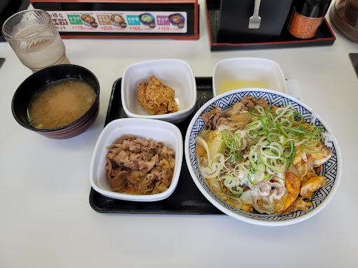 さすが吉野家さん、あっという間に着丼。(笑) まずは卵とじのお肉を一口。。( ゚Д゚)ウマー( ゚Д゚)ウマー 想像してた通りの美味しさです!😆 そして真ん中のネギをかき分け生卵を入れます。そしてまぜまぜ。。からのパクり。。( ゚Д゚)ウマー( ゚Д゚)ウマー とじた卵と生の卵が混ざりあってお肉に絡みさらに美味しくなりました!☺ そして唐揚げを一口パクり。熱っ!美味っ! 中から肉汁が出て火傷しかけました。(笑) いやいや中々美味やないですか。😊 か〇好しの唐揚げに匹敵するぐらい美味しいです! ここで肉だくを少しつまみながらお味噌汁をズズっ。あ〜美味い。(笑) ...