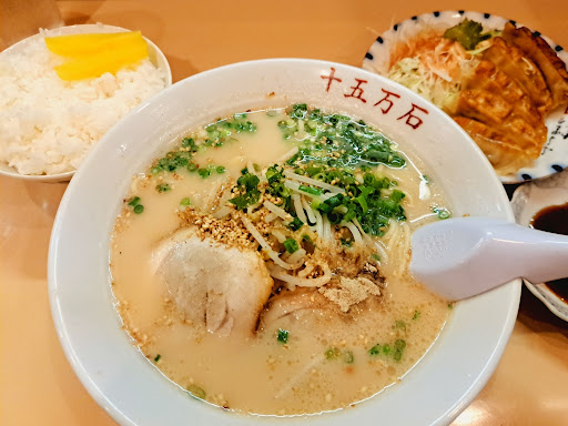 地元別府では十五万石系列店が次々に閉店する中、比較的近くで現存している貴重な店舗さんです。 夕方の6時半くらいに妻と2人で入店、先客が家族連れの方々が2組と別に1名でした。 特に掛け声も無い中着席、2名のおじさんスタッフが切り盛りしているようですが余裕が無さそうで黙々と作っておりました。 「先客さんの配膳が落ち着いたら注文しよう」と思い待っていると、入店から10分過ぎ辺りでようやく声掛けされたのでラーメンとラーメン大盛をオーダーしてしばし待機。 さらに20分ほど待つとようやく着丼。 味は十五万石系列店の中でも想像以上になかなか美味しかったですがオーダーや精算時の段取りがよろしければもっと高評価に値するかと。 愛想が悪いという事は無いですがオーダー・精算時の声掛けがスムーズですと、より立ち寄りやすいお店になるかと思われます。 ただメニューも豊富な中お二人で一生懸命作っておられるので酷な話かもしれませんが。 味☆4 接客☆2(不愛想というわけではない) という感じでしょうか。 ですが、貴重になりつつある十五万石の味を味わいたくなったらここ...