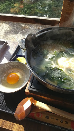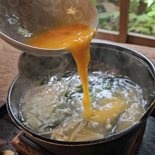 寒風吹きすさぶ、時折、あられや雪❄️の舞い飛ぶ極寒の日に訪問🤯 暖かいお部屋と雨の日雪の日の来店ドリンクでお迎え頂きました。 雨の日、雪の日❄️来店ドリンク~ ほうじ茶、梅昆布茶、紅茶、アップルティ🍎の中から、紅茶☕️とアップルティをチョイス❇️ お料理が運ばれて来るまでの間、ガラス越しのお庭を眺めながら、ほっこり出来ました🤗 ランチぞうすいは、小鉢やわらび餅も付いていてお得感満載👏 海鮮ぞうすいは、鉄鍋に入っていて、固形燃料でず~っと温められていて、食べ終わるまで熱々🔥で食せました😀 黒蜜きなこアイスとわらび餅、本日のケーキとコーヒー☕️も頂きお腹も心も大満足でした😋💮 身体も熱々🔥になり、外の極寒の事をすっかり忘れさせて頂きました。 優しい接客で心も身体も癒されました...