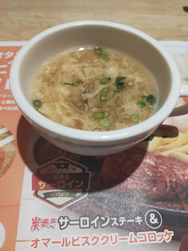 店内はファミレスそのもの、客層が普通の家族客で安心。 オーダーするとサラダバーは勿論、デザートも無料でスープも付いて釜のご飯付き。 晩飯なのでメシは大盛りで、サラダバーで取って来て肉の到着を待つ。