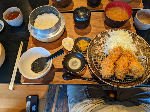 ○フード 最初にお茶と漬物が出てきます。 後でやってくる、注文したお膳にも漬物はあります。お通し??? 熟成豚肉ということで、ヒレカツ御膳(100g少なめです)をいただきました。 ヒレカツは衣はカラッとしていて、肉は柔らかく、簡単に噛み切れました。 卓上にある、岩塩かソースでいただきます。 油もお肉もアッサリしていておいしかったです。 釜炊きご飯がまた美味しい…! ツヤツヤ米粒でお米がたってました! なぜか米にめちゃテンションあがりました! 茶碗蒸しもついてきます。 キャベツ、味噌汁、ご飯はおかわり可とのことでしたが、既にボリュームがあり、全然要らなかった。笑 牡蠣フライ御膳も頼みましたが、美味しかったようです。こちらはタルタルソースがついてきます。