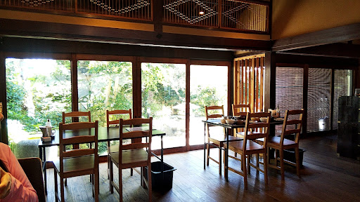 ○店内 古民家のリノベで雰囲気はとてもよいです。絵等も販売されています。 中庭と道路側に面した店内なので、割と明るく、店内は広々。 4人がけテーブルが中庭側に2つ、 2人席が道路側に4つくらい? 中央に丸テーブルというか、円形のテーブルに8席くらい? な感じです。 平日夕方早い時間だと、他には6人ほどおられたくらいで、予約はいらなかったかなという感じでした。