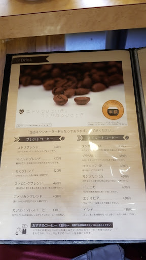 Read more飲み物も軽食も種類豊富です。デカフェのコーヒーはもちろん、オグリコーヒー(あずき入りコーヒー)なんてものも。 開店後〜11時まではモーニングタイムで、飲み物をオーダーするだけで、ゆで卵、厚切りトースト(ハーフ)、キャベツサラダ、スープが無料で付いてきます。びっくらこきました。 軽食は、サンドイッチ、ドリア、カレー、ソースカツ丼、タコライスと種類が多い。
