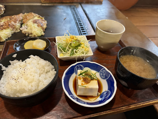 ◆お飲み焼き定食¥1,050 定食のお好み焼きは「豚」なので、単品なら¥780 ソレに味噌汁、冷奴、サラダ、沢庵、ご飯(サービスで大盛可)、ミニシャーベットorコーヒー付きで+¥270なので、断然「定食」がコスパ良いよねー♪