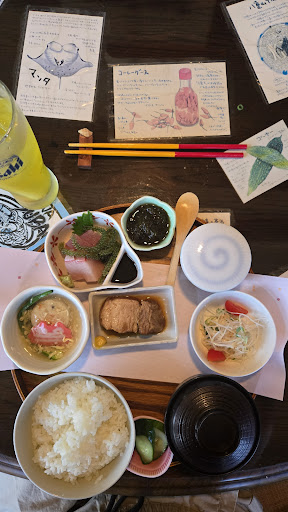 Read more沖縄料理でとても人気のお店ですね。 ランチは『ら、ふ、て、い』の4つの中から 海ぶどうとラフテーが食べたかったので『ふ』ランチに♪ 海ぶどう、プチプチ新鮮で美味しいです。 名物ラフテーは油っこくなくホロホロ柔らかくて、すごく美味しかったです。 ゴーヤの白あえも天ぷらも絶品です。 デザートの黒糖のムースもまろやかで美味しい♡ おすすめの『揚げたてサーターアンダギー』...
