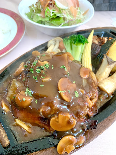 ベーコンがぐるっと巻かれたハンバーグはマッシュルームましましのデミグラスソースがたっぷり掛かり、中には炒めた玉葱入りで濃くなく優しい味わいは、ハンバーグのサイズが結構大きめなので最後まで食べやすかったです。来店時は空腹だったのでコロッケも1個頼みましたが、お陰で腹ははち切れそう。普通のおとななら欲張らなくてもハンバーグランチだけで満腹になります。 このハンバーグランチ、お店が違えば倍でもおかしくないなと思いました。
