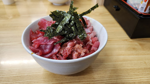 注文してから大体10分ぐらいで丼は出てきました。待たされた感はありません。中に3人、外に1人がいらっしゃって一生懸命に作ってくれます。待たせたことをどのお客様にもしきりに謝っておられましたが美味しいものを食べるのに待つのは当たり前。そんなに謝られなくてもいいですよ。待たされてイライラする方には向かないお店です。 噂に聞いていた特盛マグロ丼を頼みましたが、想像以上のスケールでした。ご飯はわさび菜を和えたものがデフォルトのようですが、白いご飯でもいいようです。店員さんが聞いてくれます。そのわさび菜も別に辛いわけではないのでそのままをお勧めします。 そのマグロですが、一度も冷凍していないものでそれがこんな量入ってこの値段は驚愕です。沖縄に行った時にも同じようなものを食べましたがそのクオリティと値段がこんなところにあるとは。しかもサーモン丼も生だとか。驚きの連続です。 その当のマグロ丼ですが、もちろん丼なのでマグロとご飯を一緒に口に入れたいのは当然ですが、掘っても掘ってもご飯が出てこない(笑)そのぐらいマグロが載っていました。切り身の刺身は何枚かでしたがあとは中落ちの切れっぱしのようなものが色んな部位が敷き詰められていて箸を入れてもなかなかご飯に到達しません。何ならご飯よりマグロの方が多いんじゃないかと思ってしまうほどです。色んな部位が入っているのでそれぞれ味わいも違い、たくさん食べていても飽きない。解凍マグロとは雲泥の差。味は間違いない。 お造りのテイクアウトもできるようでしたがこの日は売り切れ、残念。