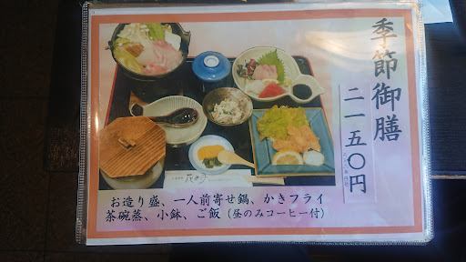 Read more以前から気になっていた店で、昼御飯で訪れました、 11時半過ぎに行きましたが、既に一組入っており、私達の後からも次から次へとお客さんが来て、平日なのにさすがに人気店です。 オーダーしたのは季節御膳で、待つこと15分くらいで料理が出てきました。 写真の通り、カキフライ、刺身、小鍋など品数が豊富で、それぞれの食材の旨味を味わえる、濃過ぎず、薄過ぎず、程良い味付けでした。 品数、味、これだけの料理を提供して、この価格なら、嬉しいコストパフォーマンスです。 店の人も気さくで、初めての来店なのに気持ち良く食事が出来ました。...