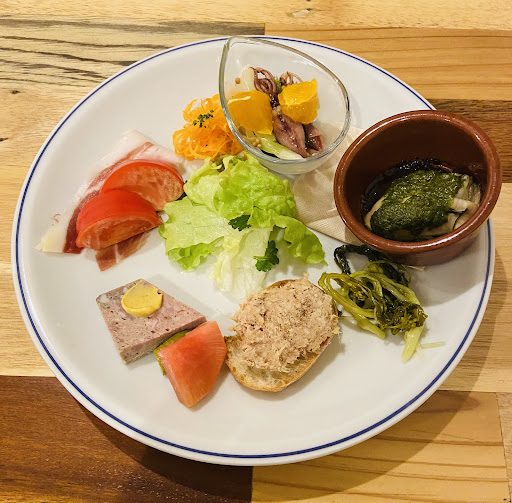 前菜の 九条ネギのキッシュも 砂ずりのコンフィも美味♥️ ロースハムは自家製で、しっとりして塩味が絶妙♥️ これならメインに期待できます。