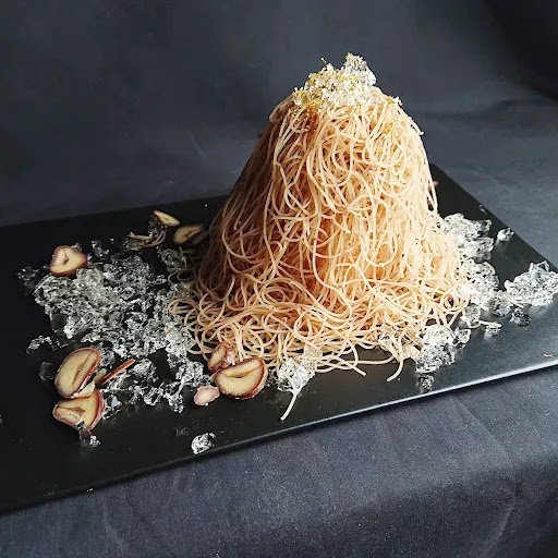高級丹波栗を極細0.1mmで絞ることで広がる、生搾りの栗の香り♡ キラキラと輝くモエ・シャンドンのジュレはまるで宝石💎 砂糖やクリームは一切入っておらず、100%栗の甘みのみ! こんな組み合わせは初めてです🥺 栗の生搾りもさせて貰った上に、 VIP仕様で金箔のトッピングまでして頂きました✨