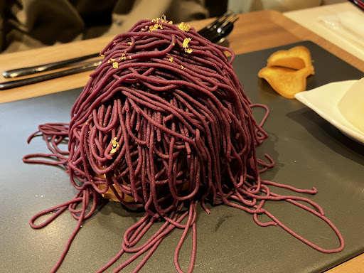 肝心のスイーツはというと、季節限定の紫芋モンブランは芋の味がしっかりしていて、尚且つ中の生クリームと相性良し。🍠 糸ピンスのチョコも口に入れた瞬間はふわっとしてますが、すぐにキュッと氷も味も締まる感じが美味しさを倍増させています。🍧 両方とも、めちゃ美味しかったです。