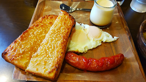 Aセット(アーモンドトースト、ソーセージ、目玉焼き、サラダに自家製プリンと飲み物が付いています)をオーダーです。