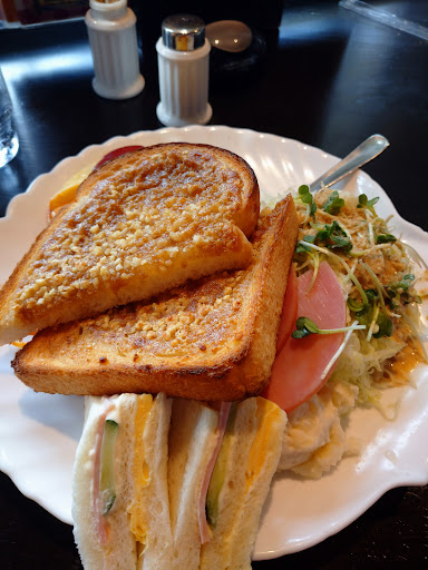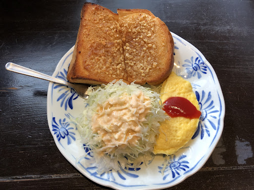 モーニングを食べに行きました。ホットコーヒーとアーモンドトーストを注文しました。コーヒーは酸味が少しありますが飲みやすかったです。しかしミルクや生クリームではなくコーヒーフレッシュだったのが残念です。サービスのオムレツ、キャベツも普通です。小さなフォークで食べるので食べづらいです。割り箸をケチってますね。SDGsに配慮してでしょうか。 アーモンドトーストが有名なようですが、モーニングのアーモンドトーストは焼きすぎです。アーモンドの風味はせず、代わりにマーガリンの嫌な匂いを感じました。写真を見ていただければ焼きすぎなのを分かっていただけると思います。