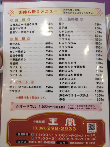 Read moreなかなか姫路の交通事情が良くなってから通る事が無くなった、名古山超えの丁度南側に昔からあるお店。 土曜日の12時過ぎに訪問、待たずには入れましたが、結構人が来店してました。 駐車場は店の入口側に3台と建屋の北に4台、壁のプレートに王関って貼ってるのを確認してね。 店内は、カウンター4席、4人用テーブル×5、4人用座敷×2の店内 本日のサービスランチか焼きそば定食だったので、それと隣の人の餃子が出てきたので見て思わず餃子を注文。 やっぱり、焼きそば定食って焼きそば&白米だったんですね。 焼きそばはイカ、海老、豚肉とか入ったソースの中華風ですかね? しっかりとした味で単品でも良いけど御飯ありが丁度美味しく味わえます、餃子も御飯ありきのまさに町中華、美味い。 これは次回、焼飯や酢豚とか味わないと! ごちそうさまでした、町中華良い...
