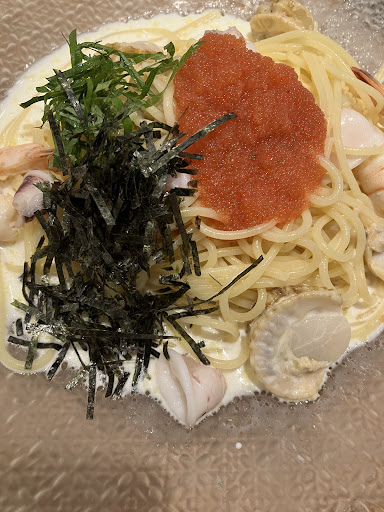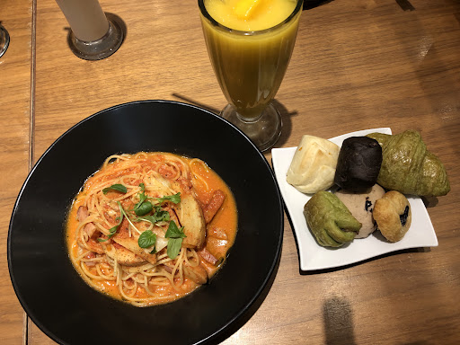 Read moreパスタ🍝やグラタンなどの中からメインを決めるとパンの食べ放題が付いています。パンは種類が豊富で、店員さんが常に席を回って大きなバスケットに入ったミニパンを一つ一つ名前を言いながら提供してくれるので、その中から好きなものを伝えるとお皿にのせてくれます。(混まない時間帯などにより同じ種類のパンばかり回ってることもあるのでその時は残念に思うから、ちょい混みくらいの時間に行くほうがいいかも)期間限定パンもあるので何度行ってもGoodなお店。パスタを食べてもパンはミニサイズだからお腹いっぱい色々食べられるから嬉しい♡ ランチやディナータイムにはセットでスープ&サラダ、ドリンクがお安く付くメニューもあります(追加で他もセット出来ます)。前はサラダ・スープは一皿ずつテーブルまで提供でしたが、今はバイキング形式になっていて自分で取りに行きます。 パスタ🍝もパンも美味しいです✨多々あるパンの名前を覚えてスラスラと伝えてくれる店員さん方は、いつ...