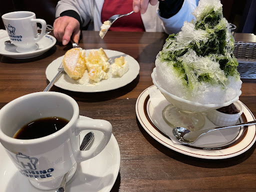 そしてやっとモノが届いた。 コーヒーも頼んでました。クリアな味で飲みやすいが、個性はない。 さて、最後は宇治金時。練乳も全部かかってるのかと思って食べてたら、食べ終わってからお椀の死角から練乳の壺が…