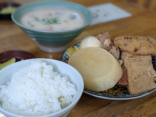 Read more2022年12月平日の午後に訪問。 おでんはその場でチョイスし店員さんに盛ってもらい、ライスと粕汁は口頭でお願いしました。 外が寒い中、粕汁は優しい味で身体の中から温まってホッコリ。 おでんは「姫路おでん」らしく、生姜醤油につけて食べるタイプ。ピリッとした辛さの中に甘さもあり絶品!牛すじと生姜醤油によく絡む厚揚げ、がんもどきがとても美味しかったです。車の運転がなければ、ビールが飲みたかった…。残念。 尚、昼どきは過ぎていたにも関わらず、結構客が入ってきて、さすが人気店だと思いました。 会計は珍しくテーブル会計。 客の出入りが多いにも関わらず、盛ってくれたおでんの種類もキチンと覚えていてくれて(タイの屋台みたい!)、そろばんを弾いて計算して...