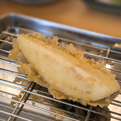 土曜日の11時30分に訪問 駐車場入口には警備員がいて 産業道路側からは満車の看板 ただどう見ても駐車場は 満車じゃないのが見える きんでん側の入口から入ると 案の定ガラガラ 警備員に聞くと 店内が混み合っているから 入車規制をしているらしい 産業道路が混むのはいいのかな? カウンター数席とテーブルは 2卓しかないのでそりゃ すぐに待ち客が出来る カウンターが数席開くも 片付けせず放置で案内されず 周りの客もオペレーションの悪さに 「段取り悪いな」と声も聞こえる 待つ事30分以上 やっと席に座り注文 天ぷら定食790円+tax ライスのお替り無料だが 忙しそうなので大盛を注文 時間経たずにあおさの味噌汁と 普通盛りのライスが提供される イラッとしながらも 揚げたてのエビとイカが 提供されたので食す エビは細いが 揚げたてで美味い で、残りの野菜の3種天ぷら 5分経っても提供されず 無料の塩辛で飯を食って待つも 提供されない 女性店員に小声で催促するも また5分経っても提供されない 少し大きめの声で催促すると 揚げ物担当の男性がお待ち下さいと やっとナスの天ぷらが配膳されるも ご注文は以上で宜しいですか?と え?野菜が2種まだなんですけど? もう一度落ち着いて催促すると 揚げすぎて穴が開いたカボチャと 甘みが出るまで揚げていない ただ衣は焦げている 半生の玉ねぎを提供される 天ぷら屋さんではないですね...