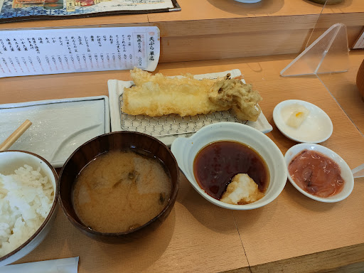 Read moreオープン前から並んで入りました。カウンター席とテーブル席がありましたが、狭いですもう少しゆったりと間隔取ってほしいです。 海老天ぷら定食に玉子天付けました。1485円でした。 まずご飯が提供されました。甘くて美味しかったです。友達が今日のお米ササニシキみたいねって言ってました。次に味噌汁いい味加減のあおさの味噌汁でした。食べ放題の塩辛とゆず大根を小皿に出していると海老天4尾揚げたてのを持ってきて、お皿にのせていただきました。その後ナス天そして玉子天 玉子天は黒薬味掛けてと仰ってたので試してみましたが、天つゆの方が好みでした。最後にかき揚げこれで終了だそうです。 揚げたてのアツアツなので、はやく食べられないけれど冷めないうちに天つゆに浸けて頂きました。 天つゆおろしがたっぷり入っていて嬉しかったです。 ご飯のおかわりも出来るそうですが、満腹でおかわりしませんでした。天茶とかしてみたかったけど満腹だった。 こうして食べてる間にも来店される方が順番待ちで、並んで座っておられゆっくりお喋りを楽しむ雰囲気ではなくて気忙しかったです。リーズナブルな天ぷら屋さんなのにゆっくり楽しめな...