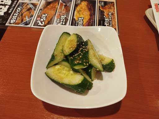 Ich hatte ein kleines Okonomiyaki mit Ei drauf, dazu hatte ich mir eingelegte Gurken bestellt.