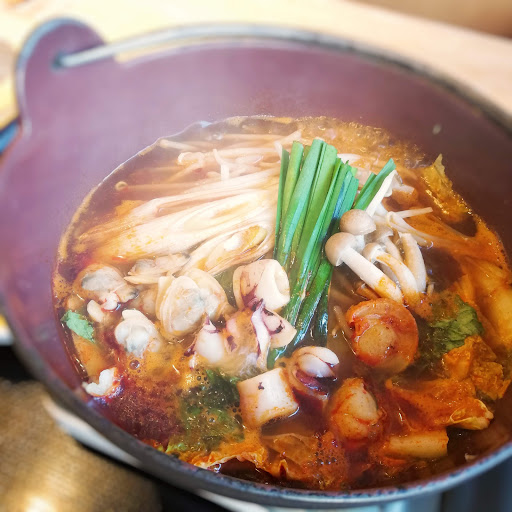Read more2020年10月訪問 さと鍋998円+tax 具材は海鮮(ホタテ、イカ、アサリ) スープはチゲ(生玉子付) 〆はご飯と漬物を選択 具材は肉かホルモン スープは醤油か塩 〆はラーメンかうどん からも選択出来る 店内はかなり広く 個室もあるようだ 約5分ほどで料理が来る 鍋はテーブルで始めて火をかけるので 出来上がりまでに10分ほどかかる 海鮮具材ははっきり言ってショボい ミニホタテ2個 小イカの切身5切 アサリは10粒位 野菜は白菜タップリで モヤシとニラと シメジと白ネギ各少量 野菜のボリュームは妥当かな 火が通ったので食べると チゲだけどそんなに辛くない スープの旨味が少ないかなと思ったが 煮詰めていくうちにいい味になる 海鮮が少ないので ダシが出るわけではないけど 味はこの値段なら及第点 〆はライスを煮込み玉子をかけ 雑炊の出来上がり おっ...