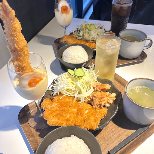 メニューは色々あって迷うほど。 揚げ物をメインにした定食から、お子様ランチならぬ、大人様ランチ。 ご飯ものだけでなく、麺類まであります。 しかも、揚げ物などのソース類が何種類もあってどれにしようか悩みます。 家内は海老から定食。 海老が5尾のちょい定食(970円)と10尾のガッツリ定食(1,280円)がありましたが、ちょい定食で。 ソース(たれ)は油淋鶏のたれにしました。 サクサクに揚がった海老に油淋鶏たれの甘酸っぱい味がめっちゃ合います。 私はチキンカツ定食。 チキンカツが1枚のちょい定食(900円)、チキンカツが2枚(1,150円)or...