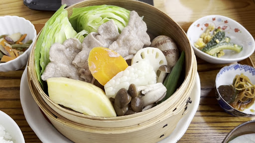 「せいろ蒸し定食」は、豚肉、レンコン、里芋、キャベツ、にんじん、そうめん瓜の具材で、彩豊かで見た目にもきれいでした。説明ではかぼちゃの皮が硬いので、皮を残して食べてくださいとご説明いただきました。 食べてみるとそうめん瓜で、蒸しが足らずに火が通っておらず、確かに硬かったです。 平戸ではそうめん瓜のことをかぼちゃと言うのでしょうか、疑問です。