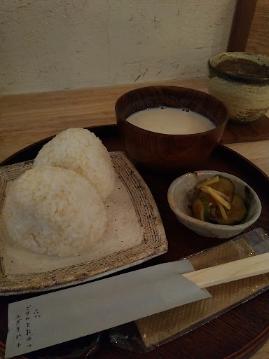 15時~17時半の間はカフェタイムで、軽食は「おにぎりセット」になります(´ω`) 玄米が入った塩おにぎりとシチュー、きゅうりのQちゃん風お漬物。 おにぎり、なかなかボリュームあり、しっかりお腹いっぱいになります(´ω`)