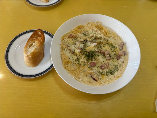 夫は渡り蟹のパスタ私はカルボナーラを シェアして食べました パスタのソースも残さずバケットにつけて食べたくなるぐらいとても美味しかったです💗💗