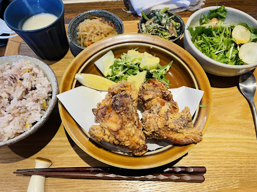 鶏野菜チーズ鍋、鶏もも唐揚げ、サワラの天ぷら、有機野菜サラダとソフトドリンクを注文。まず有機野菜がウリだけにサラダはモリモリ。サワラの天ぷらも唐揚げも大きくてジューシー、そしてどの皿も結構な量の有機野菜が添えられていて彩りも良い