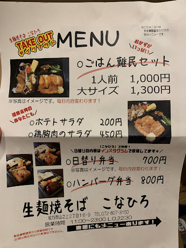 Read moreリピーターです!(投稿していなくすみません💦) 生めん焼きそばが、もちもちでめっちゃ美味しいです! 日替わりのメニューがあり、お刺身やステーキなどがあり、 毎回訪問するのが楽しみなんです。 私のお気に入りのメニューは、 生めん焼きそば、とん平焼き、海老しそ春巻き、こなひろサラダ(鶏ハムがしっとりで美味しい!)、お芋とバニラアイス(お芋がめ...