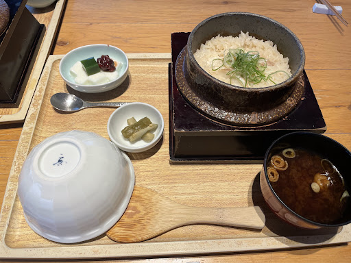 メニューを見て釜めしコースがいろいろ付いていてお得そうに見えたので、早速注文しました。 釜めしコースは2種類ありますがステーキなしのお気軽釜めしコース(2080円)にしました。 釜飯は鯛めし、季節の釜飯ということで海老としめじの釜飯、松茸と青銀杏の釜飯の3種類から選択でき、松茸と青銀杏の釜飯のみ500円の追加です。料理は一度にではなく、順に配膳されました。 ⚫︎小鉢2種 湯葉とおからでした。どちらも上品な味付けで、おからは適度にしっとりと軽い口当たりで美味しかったです。 ⚫︎茶碗蒸し 豆乳ベースの卵汁で、とっても出汁がきいており、かつ濃厚まろやかであり、今まで外食で食べた茶碗蒸しではトップレベルの美味しさでした。具は小さな海老と百合根と銀杏だったかな?が入っていました。 ⚫︎生麩田楽2種&湯葉巻き真丈の変わり揚げ 生麩田楽適度に柔らかくもっちりとして食べやすかったです。変わり揚げは3種類ありましたが、青のりのついた揚げ物が若干脂っぽかったかな。全体的にあっさりした料理だったのでそう感じたかもしれません。ただ、色々少しずつついているのがいいですね。 ⚫︎釜めし 鯛めしを選択しました。鯛がたっぷりと入っており上品な出汁が効いた釜めしで、赤出汁ととってもあっていました。量的にも申し分ないものでした。 ⚫︎デザート 抹茶と白のババロア風のスイーツに餡子がかかっていました。お口直しにもがっつりとまではいかなくても十分な量で、満足感を大きく得られました。