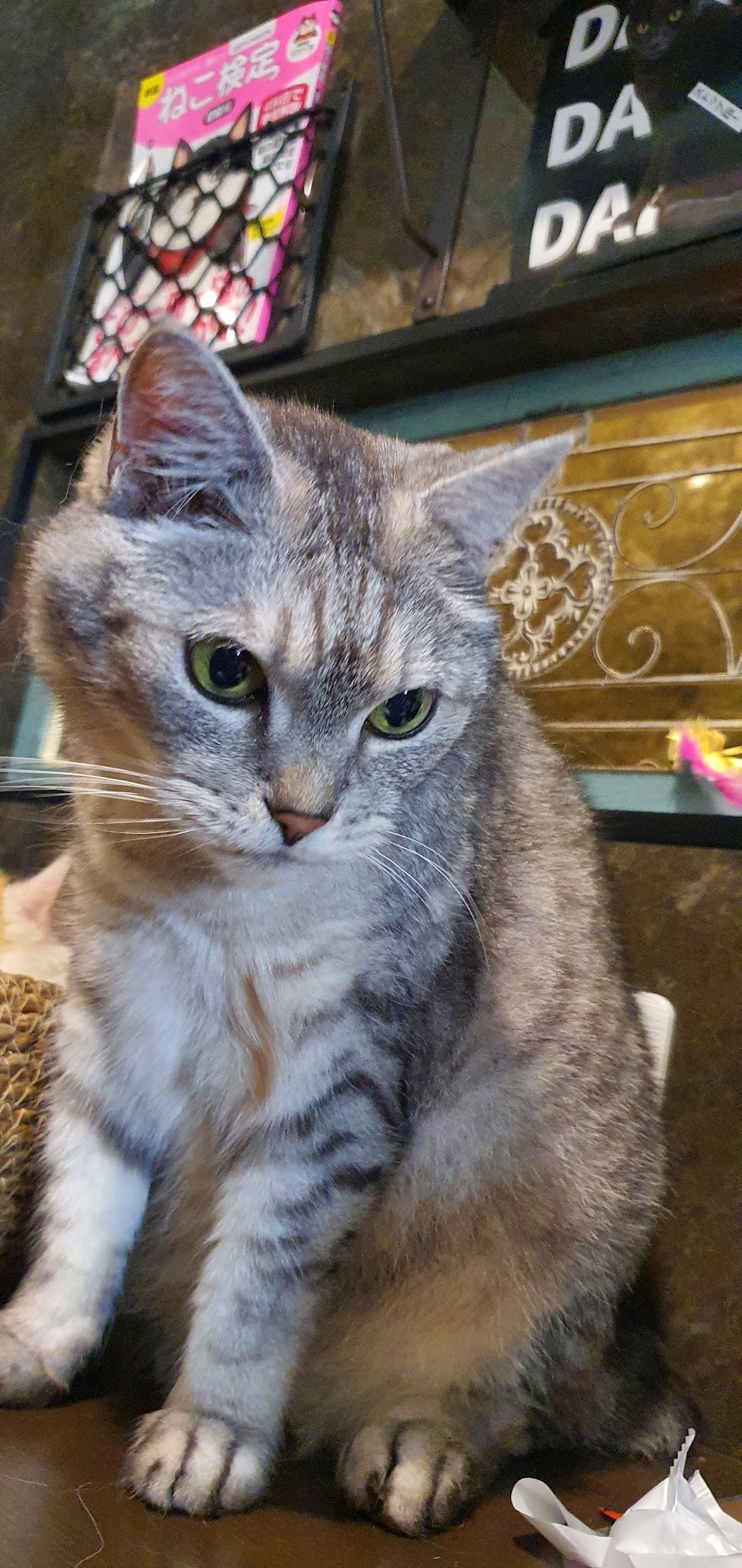 Read moreEntry fee is around ¥1100 per person, during which, you are expected to order a drink and dessert(?), it was a little confusing as we did not speak any Japanese. We ordered a caramel nuts brownie, parfait and a cat entertainement set for around ¥4200+. It was a fun experience if you happen to have time to kill. There were around 7+ cats around, with one fiesty kittt "behind bars" available for a special challenge. We were asked to sit in the corner near the cat prison, so it was kind of dull despite the staff was kind enough to bring us a kitty...
