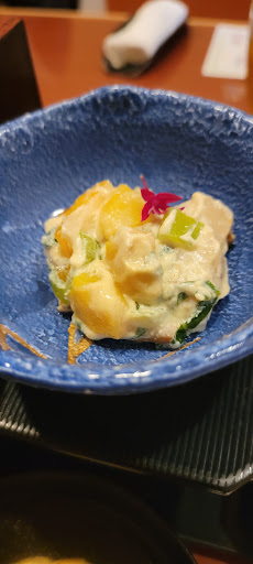 ・お造り…本マグロ、湯葉のいくらのせ、タイ、ハマチ マグロに煩い私が唸りました。 毎朝中央市場から仕入れているそうです ・えびと夏野菜のゴマみぞれソースがけ 混ぜて食べます。ネバネバです。 ・もずくしんじょうとモロヘイヤの生姜あん 汁物。塩加減が抜群!