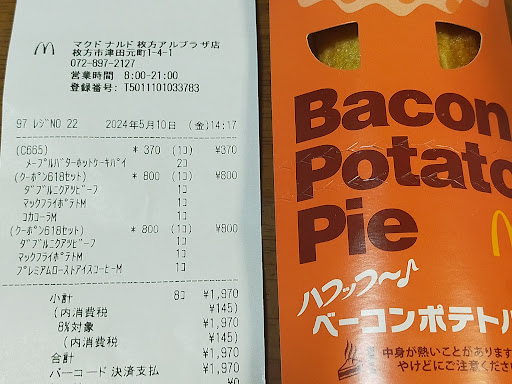 クーポンとレシートはメープルバターホットケーキパイ。 実際は、ベーコンポテトパイでした。
