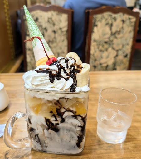 Read moreこの店が入ってるビル自体が昭和レトロ。そしてこの店がなんと喫煙可能。20才未満お断り。支払いも現金のみ。店頭のサンプルも歴史を感じさせる。 店内はタバコの臭いが充満してるが、煙くはない。 スペックからして大人のお店。これぞまさに昭和レトロ。そうそう。昔は喫茶店はどこでも喫煙可能だった。 今回のお目当ては店頭サンプルのでかいパフェの中の「チョコレートペール」 このサンプルも歴史を感じさせる。このパフェも歴史あるメニューなのだと一目でわかる。 そして、このパフェ、四角くてデカいジョッキに入っているのですが、ジョッキがキンキンに冷やししてある。そして、中に仕込まれてるフルーツもキンキン。でっかいパフェはしばしば終盤ぬるくなってしまうものだが、このパフェは最後までキンキン。素晴らしい。 タバコの香り充満する昭和レトロのお店の心遣い行き届いたパフェ。タバコの香りが許容できる大人に飲み許された...