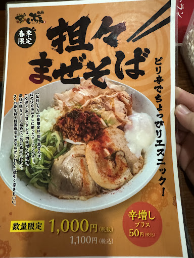 Read moreはじめて訪問しました。 ラーメンの種類が豊富で、肉もやしなどちょっと風変わりなラーメンもちらほら。 値段はちょっと高いかなという印象。 21時までやっているのはありがたいが、20時に訪問時はライスは切らしているとの事。 日曜日の20時にしては人も入っていて賑わっている印象。 店員の対応も○。 店内も清潔感があって良い印象。 今回は数量限定の坦々まぜそばをいただきました。 太麺でもちもちしていて美味しい。 味は濃いかなと想像していたらあっさりしていてどんどん食べれます。 ライスと注文してたらあっさりすぎるかな?くらいです。 他のラーメンも食べたいのでまた来...