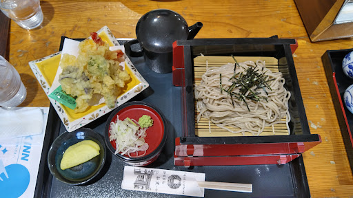 Read more自然薯そばの二枚天ざるそばをいただきました。 自然薯そばはつなぎとして自然薯(ヤマイモ)が練り込まれたお蕎麦です。 二枚天ざるそばはこの自然薯が練り込まれたざるそばが二枚重ねられたものですが、一枚の量が少なめなので、二枚でやっと普通のお蕎麦屋さんの普通盛り程度か盛りが少ないお蕎麦屋さんの大盛に届くかといったところです。 お味のほうは、なにせ自然薯そばですからはっきりと判るくらい自然薯(ヤマイモ)の味が強めです。蕎麦の香りが命な方は試さない方がいいかも知れません。自然薯そばというカテゴリからいえば美味しいですし私は好きです。