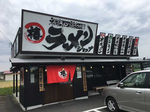 ラーメンショップ椿の看板と黒っぽい店舗が特徴的です。