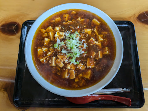 メニューを見ると麻婆豆腐が売りなのか、麻婆ラーメン、麻婆飯、単品の麻婆豆腐があったので、麻婆ラーメンと半炒飯にしました。麻婆ラーメンは縮れ麺のやや細麺で、豆腐と挽き肉がたっぷり入り、食欲をそそる辛さで、スープも良い味でした。半炒飯も半とは思えない盛りの良さで、チャーシューやなると、グリンピースなど具材も鮮やかで、町中華の焼き飯という感じでボリュームがあり、美味でした。麻婆ラーメンが920円で半炒飯が470円です。