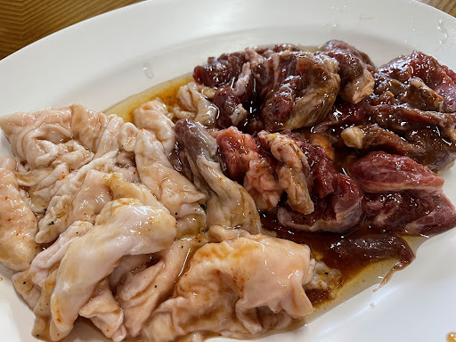 Read moreボリュームあります。 写真は順にラム肉・カルビ、ホルモン・ジンギスカン・セットのホルモン、セットの餃子・スープ、ライス、タレ…