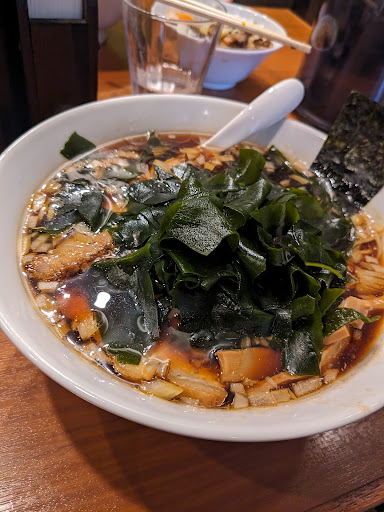 私はラーメンブラック仕様ワカメです。スッキリした醤油スープにはワカメがよく合いました。 スープはブラック仕様にするとかなり濃く、麺をすするときのパンチがあります。独特の香りと甘みのある醤油を使っていて癖になります。 麺は中太ストレートでモチッと歯ごたえがありました。 玉ねぎも甘めのメンマも、このスープに丁度良くなっています。 そしてバラチャーシューはホロホロで、この店の醤油の香りがより強く感じられる絶品でした。