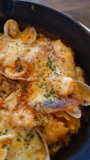 パエリアの具材には、海老、ムール貝、アサリ、イカ、パプリカ、グリーンピースなどが入っていました。 炊きあげられた米はベシャベシャにならずに仕上がりもちょうど良い水分量です。 魚介類のエキスを吸い込んで旨味たっぷりで、クセになる美味しさです。 なかなか満足度の高いパエリアでした。